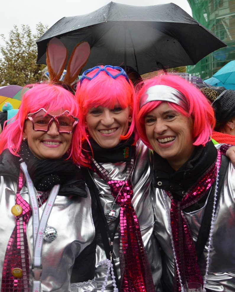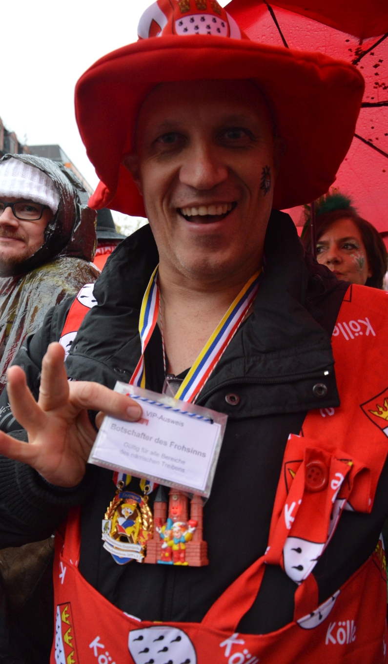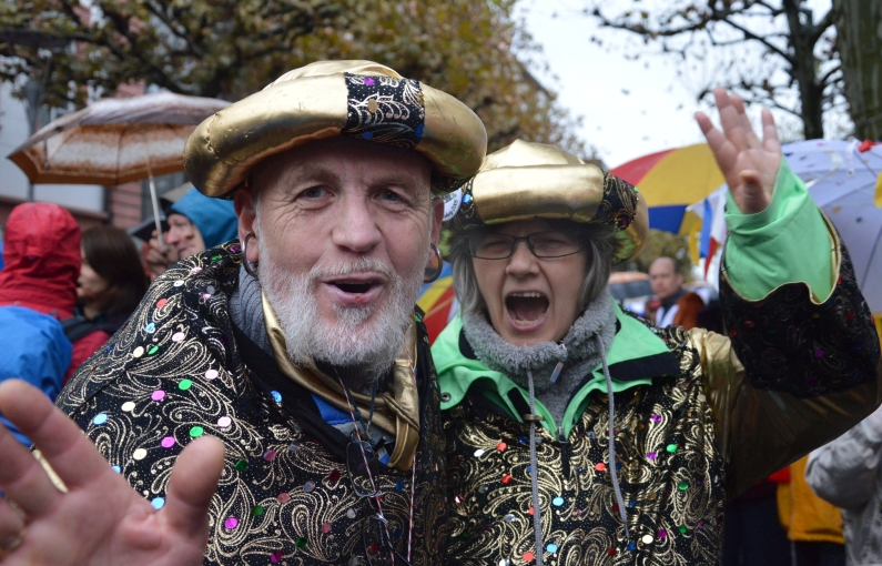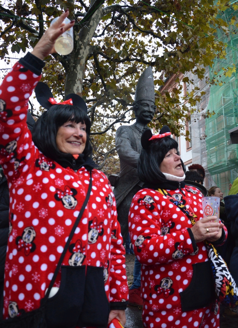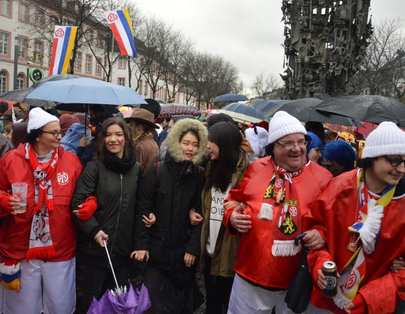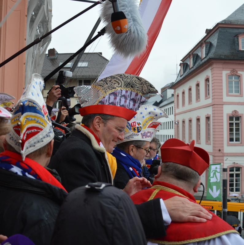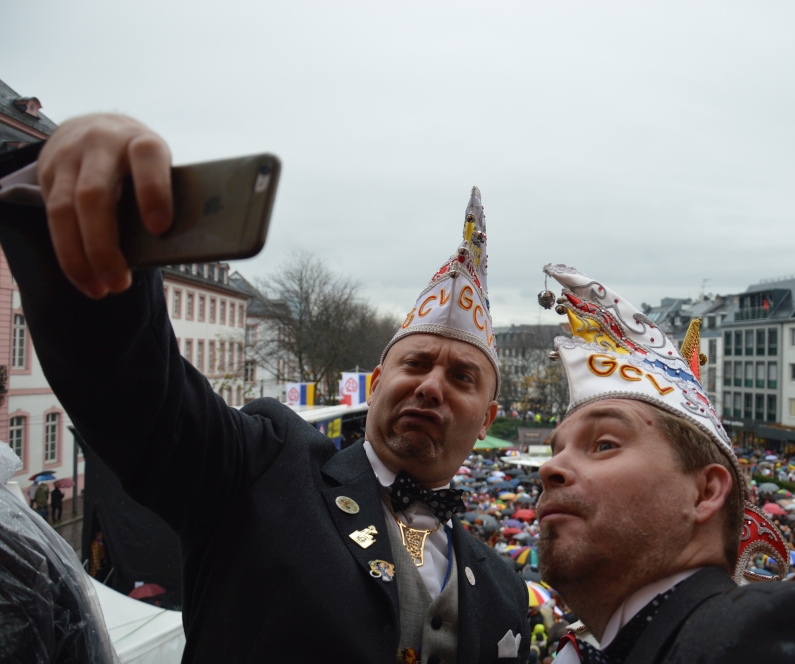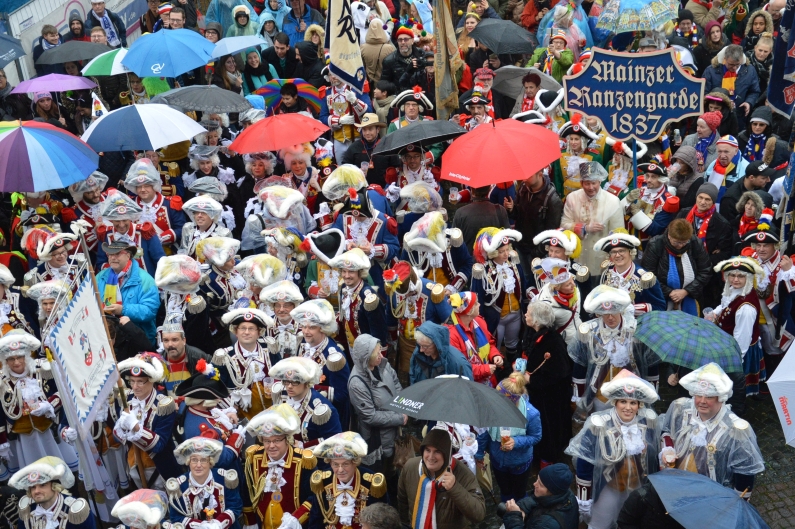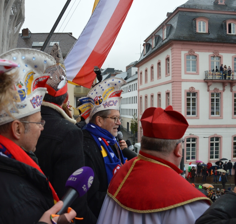 „Gibt’s auf der Welt auch sehr viel Trubel, heut‘ ist ganz Mainz im Freudenjubel“, rief Oberbürgermeister Michael Ebling (SPD) den Narren unten auf dem Schillerplatz zu. Dort hatten sich trotz strömenden Regens schon ab 10.00 Uhr die Narren versammelt, um Gott Jokus und dem bunten Treiben zu huldigen. Viele Garden schickten Vertreter mit ihren bunten Uniformen, Schwellköppe wurden gesichtet – aber es feierten auch ganz viele normale Narren in bunten Kostümen. „Da spüren wir wie eh und jeh: Ach Kinner, ist das Leben schee“, reimte Ebling.