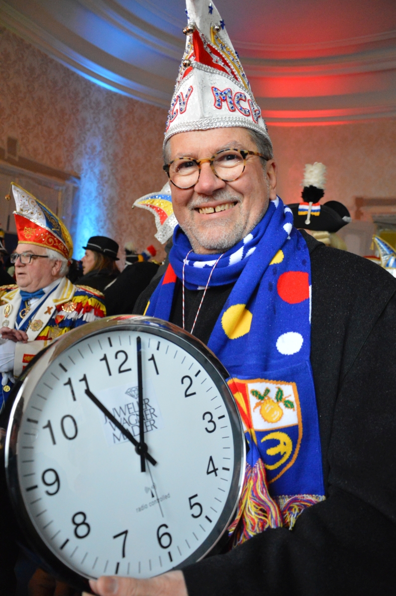 Natürlich war es pünktlich um 11.11 Uhr, Reinhard Urban hatte eigens eine atomgesteuerte Funkuhr mitgebracht. Und genau um 11.11 Uhr am 11.11. ließen die Narren mit Helau den Schillerplatz erbeben – die Fastnacht hatte für einen Tag Ausgang in Mainz. Der Beginn der Kampagne ist das nicht, wie der neue MCV-Präsident Urban noch einmal klarmachte: Am 11.11. lüpfen die Narren nur mal kurz den Vorhang und feiern die Freiheit des Narren, die Gleichheit und Brüderlichkeit und überhaupt das Leben. „Man soll, man darf nicht nur im Herzen, sondern auch ganz öffentlich Narr sein“, betonte Urban. 4.444 Narren bevölkerten zur Spitzenzeit den Schillerplatz – trotz 4 Grad und Regen. Bis in den Abend hinein wurde gefeiert.