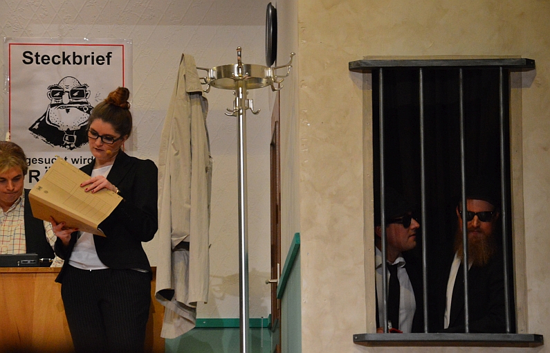Es ist eine herrliche Polizeicrew, die da durch den Abend führt, großartig verstärkt durch Christina Grom als Melitta und geziert durch eine herrlich nervige Staatsanwältin Lea Heymann. Peter Büttner mimt den GCV-Hausmeister, und der hat Schreckliches zu vermelden: Die Komiteekapp‘ vom Sitzungspräsidenten ist weg, dazu Kostüme, eine Ehrennadel – vor allem der Wein und ein Kasten Bier.