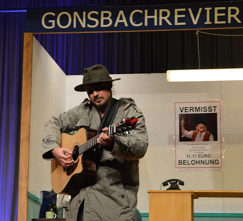 Im Gonsbachrevier geht es eher gemütlich zu. Schimanski – Sitzungspräsident Sebastian Grom mit Trenchcoat und Pferdeschwanz – und sein Kollege Wachtmeister Becker (alias Rudi Hube) kommen natürlich erst mal zu spät – der eine ist über die Schiersteiner Brücke gekommen, der andere über die Weisenauer. Nix wie Stau in Mainz. Der jungen Kollegin Melitta wiederum steht eine hochmoderne Schreibmaschine zur Verfügung – und an der Wand hängt eine Vermisstenanzeige: Gesucht wird Guddi Gutenberg, denn der hat vergangenes Jahr seine Druckermütze ans Denkmal gehängt und ist verschwunden…