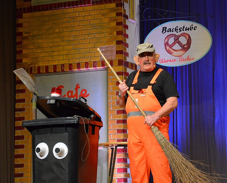 Prompt betritt die Bühne – ein Straßenkehrer, der verteufelte Ähnlichkeit mit dem Verschwundenen hat. Hans-Peter Betz genießt sichtlich die Freiheit, in neue Rollen zu schlüpfen und mimt den „VE“, den verdeckten Ermittler mit Kehrbesen und James Bond-Mülltonne. Ob Kampfradler, Hundehaufen, Veganer-Hype oder Marktfrühstück, der Fake-Feger räumt kräftig auf in der Stadt und vergisst natürlich auch den Tag der Deutschen Einheit nicht: „Gestern haben sie noch einen Scharfschützen gefunden, den hatten sie auf dem Dach des Staatstheaters vergessen“, berichtet der Betz. So streng seien die Sicherheitsvorkehrungen am 3. Oktober rund um den Dom gewesen, „wenn da einer gefurzt hätte, den hätten sie als Gefährder nach Afghanistan deportiert.“