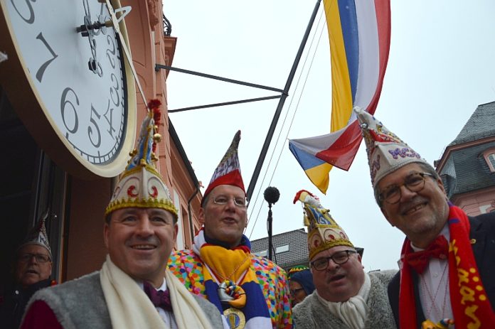 Der 11.11. wird in Mainz traditionell vom Balkon des Osteiner Hofs eröffnet. In diesem Jahr tickte eine überdimensionale Uhr auf dem Balkon, mit goldenem Konfetti wurde die Narrenzeit begrüßt. Rund um den Schillerplatz drängten sich Garden und allerlei närrisch kostümiertes Volk, 8.000 waren nach Angaben der Mainzer Polizei gekommen. So viele wollten dabei sein, dass der Einlass zum Schillerplatz sogar wegen Überfüllung für etwa 20 Minuten gestoppt werden musste.