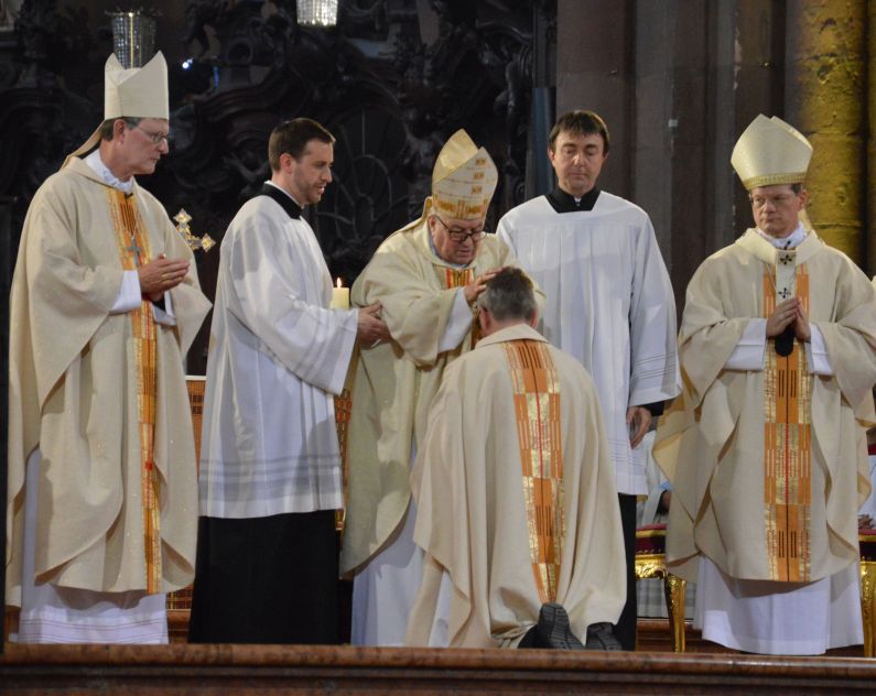 Der Münchner Bischof, Kardinal Reinhard Marx, weiht im Mainzer Dom den neuen Mainzer Bischof Peter Kohlgraf, Altbischof Lehmann schaut zu. – Foto: gik