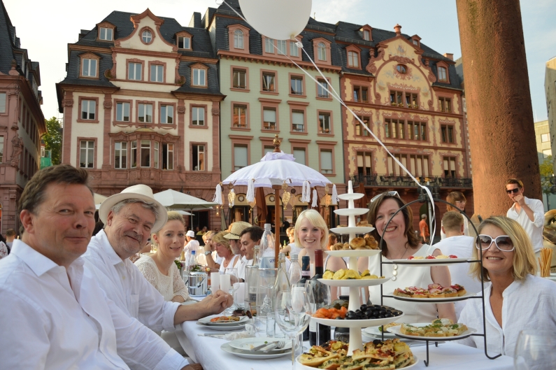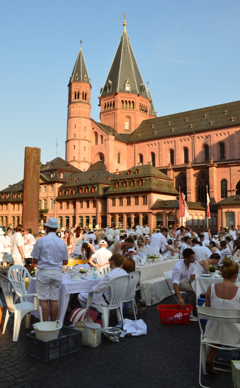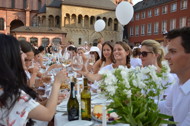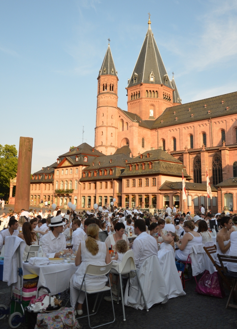 Weltweit gibt es inzwischen Diner en Blancs, in Rheinhessen gibt es gleich mehrere kleine, in Ginsheim feierten sie am 22. Mai, im Rheingau soll es das erste Diner en Blanc am 12. Juni geben. In Mainz gab es das Abendessen in weiß bereits vier Mal: am Rheinufer, auf dem Kupferberg und natürlich in wunderschöner Kulisse 2014 und 2015 am Dom. Und die Picknickfreunde hatten eigentlich immer Glück mit dem Wetter: Es waren immer wunderbare Sommerabende.