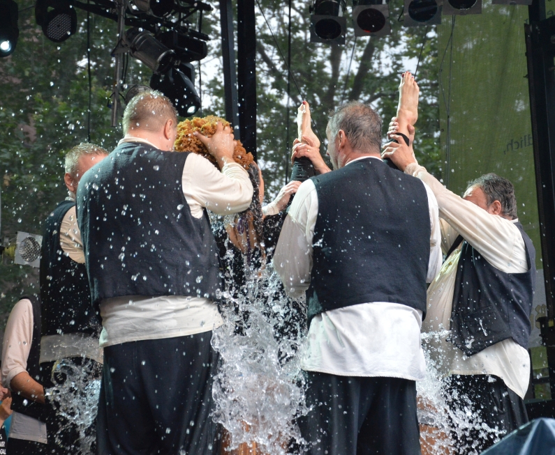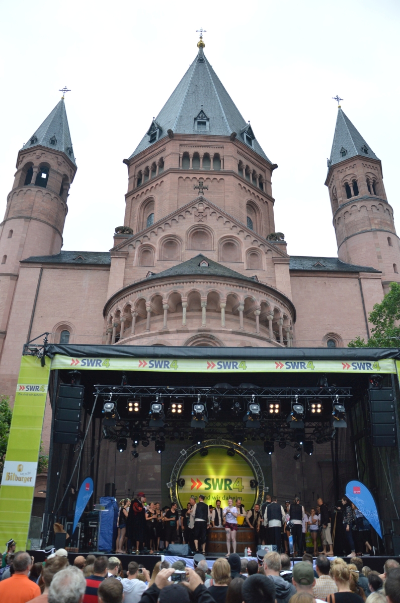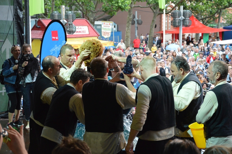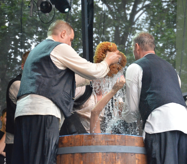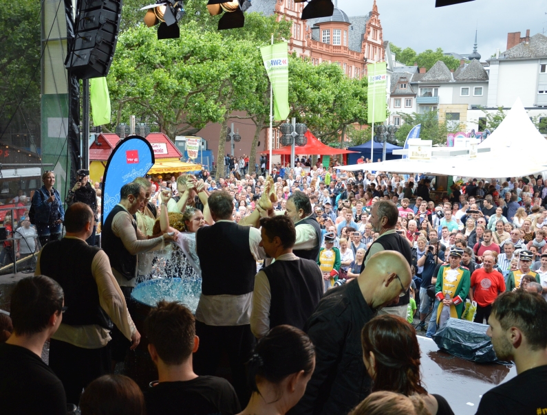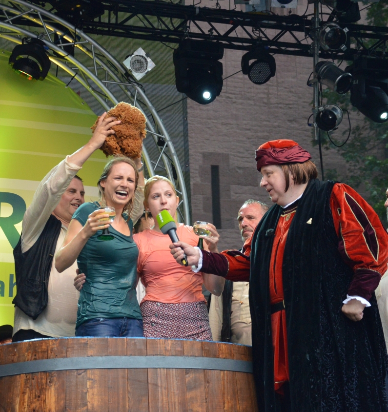 Feucht war es, das Wasser floss in Strömen – aber ausnahmsweise mal nicht vom Himmel: Auf der Bühne am Dom platschte das Wasser aus dem großen Zuber der „Jünger Gutenbergs“, mit großer Gaudi wurden auch in diesem Jahr wieder 28 Buchdrucker und Mediengestalter von der schwarzen Tinte der Lehrzeit reingewaschen. Und im Zuber landeten auch drei Prominente: Büergemeister Günter Beck (Grüne) erwischte es eiskalt, und auch die Mainzer Weinmajestäten landeten auf offener Bühne im Zuber.