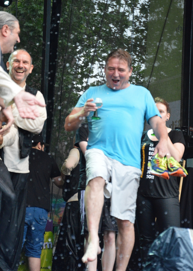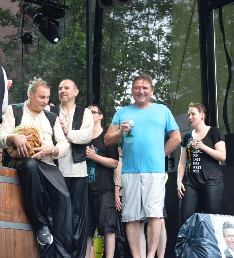 Und da die Johannisnacht ja zu Ehren des Buchdruck-Erfinders Johannes Gutenberg gefeiert wird, gehört das Gautschen zu den Institutionen des Festes – rund 1.000 Schaulustige genossen auch dieses Mal das Schauspiel. Dazu gehört auch, dass ein Promi ins kühle Nass muss – in dieesem Jahr traf es Bürgermeister Günter Beck. Der sei ja schließlich mal interimsweise Oberbürgermeister gewesen, verriet Neuhardt den Grund – damals, nach dem Rücktritt von Jens Beutel (SPD). „Wir haben bisher alle OBs gegautscht“, sagte Neuhardt, „der hatte uns noch gefehlt.“