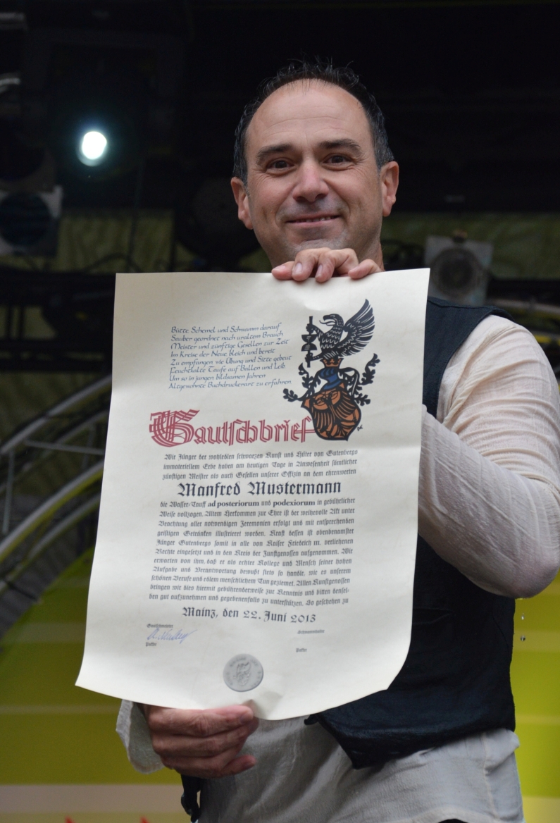 Zuvor hatten die Packer schon mehr als zwei Dutzend Mal kräftig zugelangt, jedes Mal landete ein junger Absolvent oder eine Absolventin mit lautem Platschen und noch größerem Hallo im Zuber. Kräftig getunkt wurde da, um nach alter Sitte den Dreck der Lehrzeit abzuwaschen – so handhaben es in Mainz von Alters her die Buchdrucker. „Das war früher ein ganz erlesener Kreis, die konnten Lesen, Schreiben und eben auch Drucken“, erklärte Gautschmeister Neuhardt den Brauch.