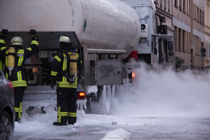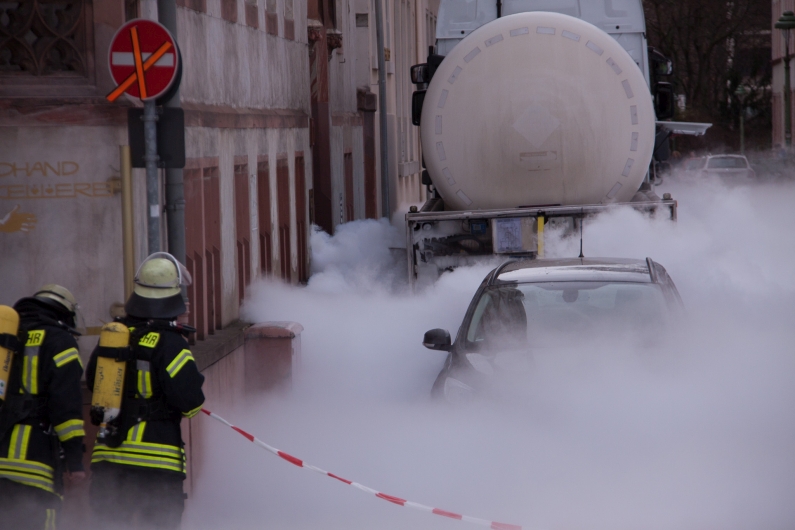 Um 12.45 Uhr wurde die Feuerwehr alarmiert, weil aus dem Lastwagen an der Goldhand Sektkellerei am Kupferberg CO2 ausströmte. „Wir versuchen das Gas abzusperren, haben aber noch keine Möglichkeit gefunden“, sagte Markus Lunnebach von der Mainzer Feuerwehr Mainz& am frühen Nachmittag. Aus dem Tankzug in der Walpodenstraße strömte weiterhin CO2, vermutlich sei ein Leck am Verschlussventil die Ursache. Genau sagen könne man das derzeit aber nicht – das CO2 verursacht dichten Nebel… „Die ganze Straße ist bis in einer Höhe von 1,20 Meter und 1,50 Meter von weißem Nebel bedeckt“, berichtete Lunnebach.