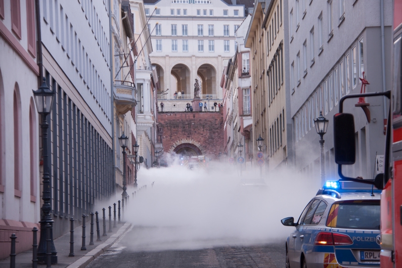 Mehr noch: Das Gas, das schwerer ist als Luft, sickerte die Straßen hinunter zum Schillerplatz und verteilte sich auch dort. „An und für sich ist CO2 ein ungefährliches Gas, nicht brennbar“, beruhigt Lunnebach. Doch CO2 ist schwerer als Luft und verdrängt deshalb den Sauerstoff am Boden. Die Feuerwehr musste deshalb den Schillerplatz bis zur Großen Langgasse und zum Proviantamt komplett sperren und Gebäude und Geschäfte im Erdgeschoss sicherheitshalber evakuieren. Und das kurz vor Weihnachten im letzten Einkaufstrubel…