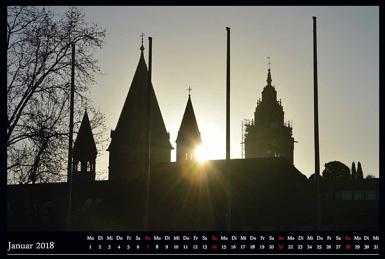 Unser erster Streich kommt in der Größe Din A4 daher, damit auch in der kleinsten Hütte Platz dafür ist. Eine Spiralbindung am oberen Rand sorgt für den nötigen Halt bei der Aufhängung, verstärkt ist der Kalender mit einer Pappe auf der Rückseite, so kann man ihn auch bedenkenlos versenden. Wir hoffen, dass er Euch gefällt und würden uns natürlich sehr freuen, wenn wir mit unseren Mainz-Ansichten Euer Jahr 2018 bereichern dürfen. Eignet sich natürlich hervorragend auch als Geschenk für weggezogene Mainzer oder Studi-Eltern, die mal sehen wollen, wo es Sohn oder Tochter so hin verschlagen hat. Viel Spaß damit!