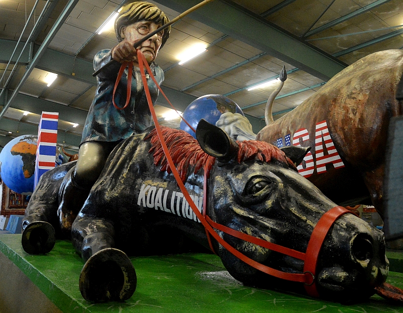 Eine Bauchlandung macht ein paar Schritte weiter auch der GroKo-Gaul, das arme Tier ist regelrecht „ausgemerkelt“, unerbittlich platt geritten von der Kanzlerin. „Die Merkel versucht noch, mit einer AKK-Karotte den Gaul zum Aufstehen zu bewegen, aber vergeblich“, sagt Dieter Wenger schmunzelnd. „Schwarz-Rot regiert mit Mühʼ und Not“, reimen dazu die Narren: „Die Merkel lebt, der Gaul ist tot!“