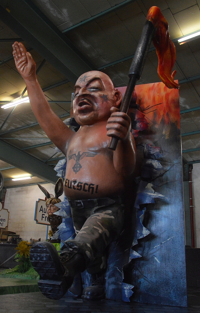 Das gilt auch für den AfD-Mann gleich nebenan: „Vorne Biedermann, kann kein Wässerchen trüben, und auf der Rückseite kommt er zündelnd raus“, sagt Dieter Wenger, und weist auf den wahrhaft angsteinflößenden deutsch-nationalen Glatzkopf mit Brandfackel und Hitlergruß – der Narren Kommentar zu den Ereignisse in Chemnitz. „Es wird gezündelt und gehetzt, an der Seite vieler AfD-Politiker marschieren Neonazis und Skinheads – da helfen auch keine seriösen Anzüge und hübschen Wahlplakate“, kritisieren die Mainzer Fastnachter.