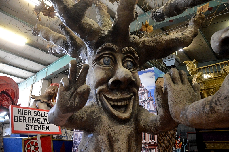 Wengers Running Gag ist aber jedes Jahr der kleine Narrenhund, wo er dieses Jahr sein Beinchen heben wird, weiß der Wagenbauer noch nicht so richtig. Vergangenes Jahr war es der Mainzer Bibelturm, der schon bedrohlich auf seine Erfinderin kippte, in diesem Jahr feiern an seiner Stelle die Platanen vor dem Gutenberg-Museum, dass der Turm nicht kommt: „Hurra, wir leben noch!“ heißt’s auf dem Wagen mit der Zugnummer 8, auf dem sich zwei Platanen fröhlich abklatschen. Natürlich werde das Hündchen nicht an den Bäumen sein Beinchen heben, sagt Wenger entrüstet: „Die mag er ja.“