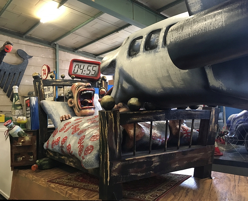 Nebenan erlebt der Mainzer Michel jeden Morgen in seinem Bett einen wahren Horrortrip: Pünktlich um 4.55 Uhr heißt es „Steh auf, weil Du halt Mainzer bist“, denn dann donnert der erste Frankfurter Flieger nicht nur übers Haus, sondern gleich direkt durchs Bett des armen Narren. Der sucht Ruhe in Schnaps und Baldrian, doch vergeblich: „Zur Morgenstundʼ geht’s richtig rund, statt Gold hat Lärm sie nur im Mund“, reimen die Narren: „Der Nachtschreck kommt um vor 5.00 Uhr morgens, täglich grüßt das Düsenmonster.“