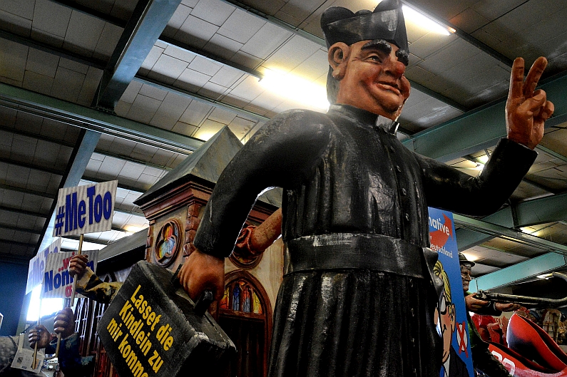 Nein, das närrische Hunde-Geschäft wird wohl eher an einem speziellen Wagen zum Einsatz kommen: Dort, wo der Herr Pfarrer aus einer Gemeinde in die nächste flüchtet, den Koffer „Ihr Kinderlein kommet alle zu mir“ fröhlich in der Hand schwenkend. Im verlassenen Haus hinter ihm schwenken derweil all die ihre Protestschilder, die „Meetoo“ sagen müssen – der bitterböse Kommentar der Narren an den Missbrauchsskandalen der katholischen Kirche, zusammengefasst in dem, was sie „Schweinepriesters Nachtgebet“ nennen: „Lieber Gott, mach mich fromm, dass ich zu den Kindlein komm./ Schließ die Augen, schau nicht hin, wenn ich übergriffig bin./ Werdʼ ich doch geschnappt dabei, schick mich in die nächst Pfarrei.“