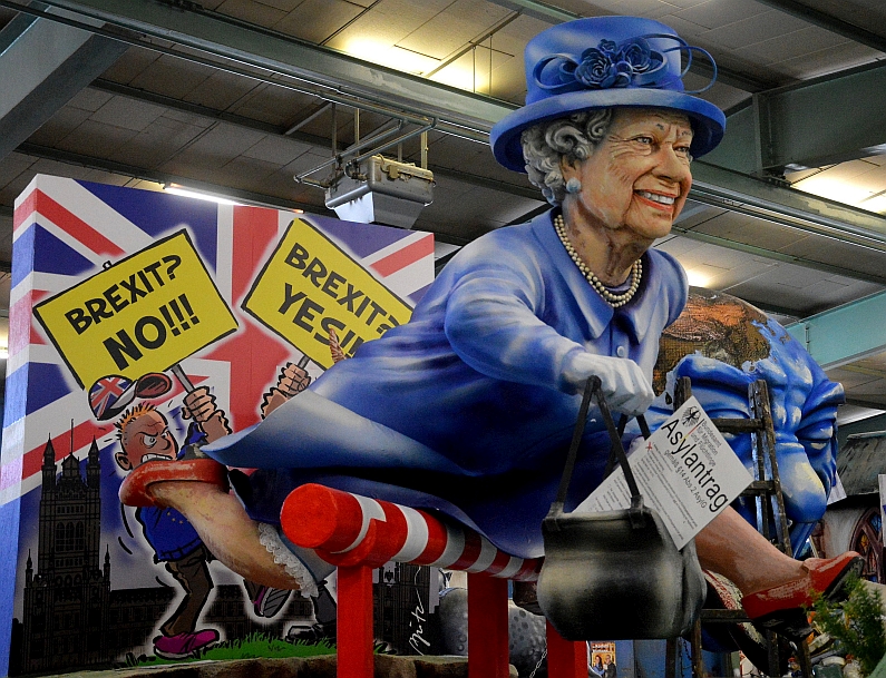 Und das hat sich so richtig gelohnt: Unglaublich ausdrucksstark, dazu politisch bissig und hochaktuell präsentieren sich die Motivwagen 2019. Seit nunmehr 57 Jahren baut Wenger die närrischen Motivwagen, der 79-Jährige ist längst eine Legende in der Wagenbauer-Szene. Im Gegensatz zu seinen Kollegen in Düsseldorf und Köln arbeitet Wenger mit Stahlkonstruktionen und Styroporblöcken, dadurch sind seine Motive haltbarer und erlauben atemberaubende Konstruktionen. Da schwebt die Erdkugel völlig frei in der Luft, „das macht uns keiner nach“, sagt Wenger zufrieden. Und die Queen setzt im Hürdensprint über den Grenzpfahl in Richtung EU, den Asylantrag in der rechten Hand, ihre geliebten Corgies fliegen links hinter ihr her. „Der Brexit wird der Queen zu viel, drum bittet Lisbeth um Asyl“, reimen die Mainzer Narren dazu: „Fucking May!“