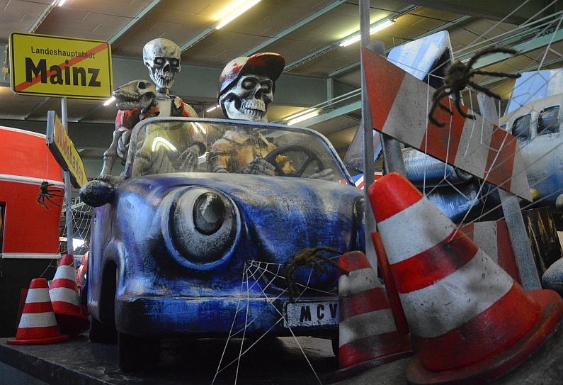 Es sind diese kleinen, pfiffigen Details wie eben die Karotte, die Wengers Spezialität sind. Den Müll für die Weltkugel haben sie wochenlang in der Wagenhalle gesammelt, der echte Müll wurde 14 Tage lang mit Lack auf dem Wagen besprayt, damit der Berg hält. Die Insassen des staugeplagten Mainzer Autos sind längst zum Skelett geworden, in der Schlange verstorben, sozusagen, und um ihr Auto herum nisten längst riesige Spinnen, derweil der Wegweiser hinter ihnen nicht länger nach Wiesbaden., sondern nach Filzbaden weist – ein Hinweis auf die jüngsten Skandale rund um Einladungen, Essen und üppige Reisen des Wiesbadener Oberbürgermeisters Sven Gerich (SPD).