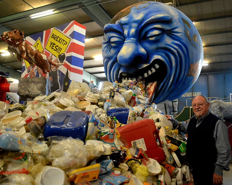 Der Welt geht es schlecht, aus ihrem Schlund quillt ein unaufhörlicher Strom. Es sind Plastiktüten, Plastikkanister, Plastikbecher – die Welt erstickt an Müll, und die Narren finden das gar nicht komisch. Mit spitzer Feder glossieren die Mainzer Fastnachter auch in diesem Jahr wieder die hohe Politik und nehmen Pleiten, Pech und Missgriffe aufs Korn. Da kippt SPD-Chefin Andrea Nahles aus den viel zu großen SPD-Latschen, die Queen türmt vor dem Brexit und Donald Trump verpupst als riesiges Rindvieh das Weltklima. Elf politische Karikaturen in dreidimensionaler Form hat Wagenbauer Dieter Wenger für den Mainzer Rosenmontagszug gezaubert, mit seinen Konstruktionen übertrifft sich der 79-Jährige in diesem Jahr selbst. Und auch, dass es überhaupt elf Motivwagen 2019 geworden sind, haben die Mainzer Narren dem persönlichen Einsatz Wengers zu verdanken.