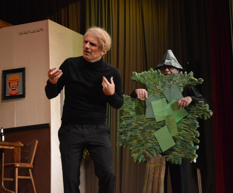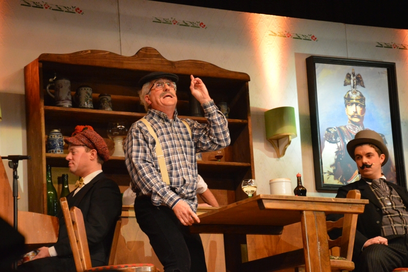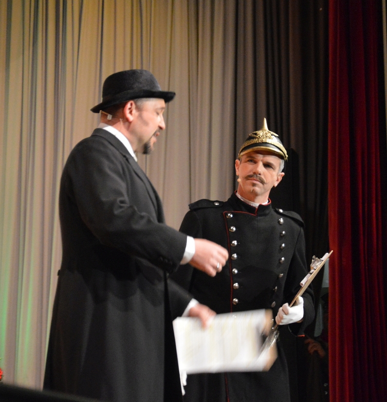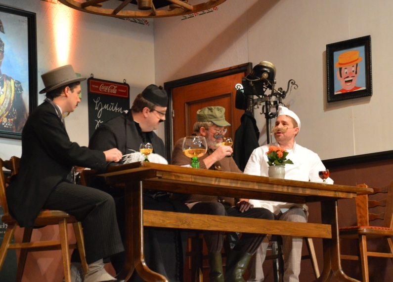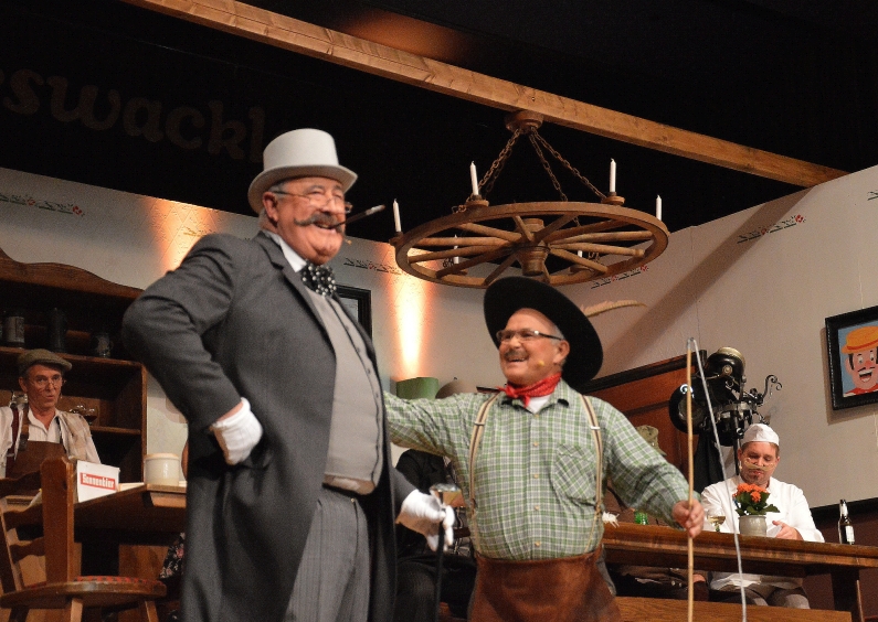 Wunderbar dabei die Neuentdeckung Peter Büttner als „Parrer“ mit Riesen-Piffche (Riesen-Weinglas), der gegen Ende seinen Rausch so überzeugend spielte, dass Grom ihn völlig verdutzt fragte: „Spielst Du das noch, oder bist Du echt so voll?“ Was ist schon das vorbereitete Skript, wenn man in Gunsenum ist? Wenig ert, war die Antwort am Samstagabend: Ob die Technik streikte, die Schnurrbärte rutschten oder der Text einfach ausblieb – die Akteure auf der Bühne rissen mit spontaner Situationskomik („Die E-Mail mit dem Text von 1892 hat sich wohl verspätet“) alles raus, was da kam und die Zuschauer so erst recht zu Lachsalven hin.