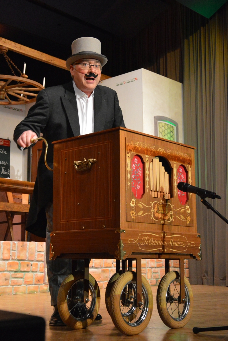 Nein, es war keine übliche Sitzung mit Protokoller und Guddi Gutenberg – und das bekam den Kammerspielen ausgesprochen gut. Die Nachrichten Anno 1892 verkündete stilecht der Leierkastenmann, und Peter Beckhaus verkörperte wieder einmal mit viel leisem Feinsinn eine nostalgische Figur. Den Kurbelkasten mit Strippe, genannt Telefon, verkündete er als neueste Erfindung, ebenso die Rolltreppe und das Weckglas mit dem Gummiring. Nur eines, das war doch immer gleich in Mainz: Anno 1892 bauten sie die Gleise für die Ludwigsbahn durch Mainz, und „durch die Bauarbeiten liegt der Stadverkehr ganz lahm…“