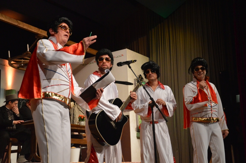 „Es läuft, die Sitzung ist fast komplett“, seufzt Lehrer Grom glücklich – und dann kommen doch noch die Elvis Brothers. Noch einmal legen Emrich, Hellmold, Heininger und Schier närrische Situationskomik pur aufs Parkett, kämpfen mit sich auflösenden Perücken und rocken mit Rucki Zucki nach Elvis-Manier den Saal. Für atemlose Gänsehaut aber sorgt eine ganz besondere Ballade: Wenn das Heile Gänsje „In the Ghetto“ erklingt, dann hält der Saal die Luft an, scheint die Welt einen Moment lang still zu stehen – ein Geniestreich von, natürlich, Christian Schier.