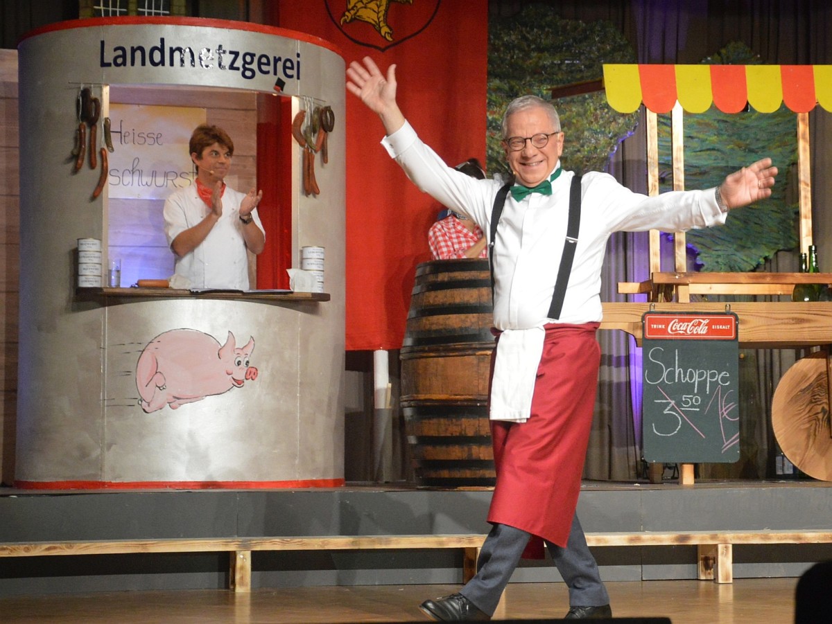 Es kann nur noch närrischer werden – und das zelebrieren de‘ Karl alias Rudi Hube und die Elsbeth alias Michael Emrich, die ein französisches Galadiner gewinnen, und natürlich Kellner Achim Hube in den Wahnsinn treiben und am Ende mit Koch Johannes Emrich in die Küche entschwinden – Michael Emrich frönt mal wieder seiner Leidenschaft zur närrischen hohen Kunst in Frauenkleidern, während die Söhne Hube und Emrich ihren alten Herren französisch-gewitzt durchaus das Wasser reichen können – groß.