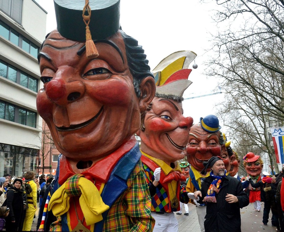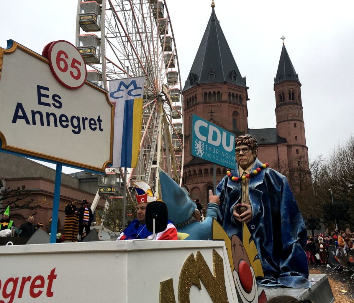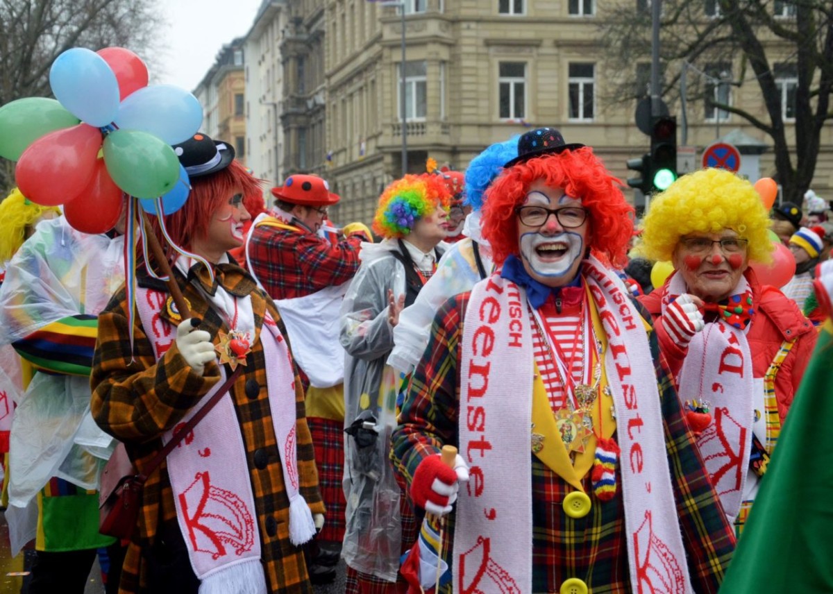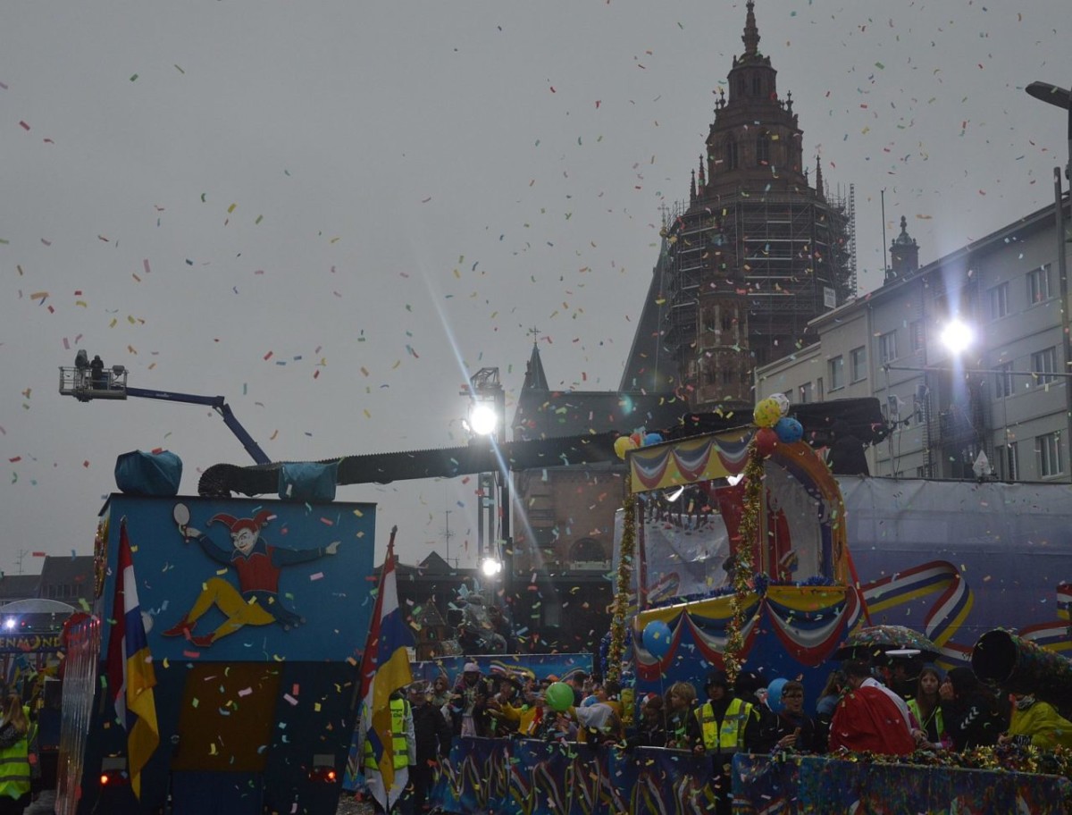 Der Himmel so grau, die Narren so bunt: Friedlich, fröhlich und ausgelassen haben am Montag an die 500.000 Narren in Mainz den Rosenmontag gefeiert. Pünktlich um 11.11 Uhr setzte sich in der Mainzer Neustadt der 69. Mainzer Rosenmontagszug nach dem Zweiten Weltkrieg in Bewegung – und pünktlich um 11.11 Uhr öffnete der Himmel seine Schleusen. Ein kräftiger und ausgesprochen hartnäckiger Nieselregen vergällte den Mainzer Narren den Start in den höchsten närrischen Feiertag. Abhalten ließen sich die meisten davon indes nicht, warm eingepackt in bunten feierten Hunderttausende den Zug, die Narretei und die politische Satire. Es wurde ein langer Tag: Der Rosenmontagszug dauerte fast eine Stunde länger als sonst, auch wegen der vielen großen Lücken im Ablauf.