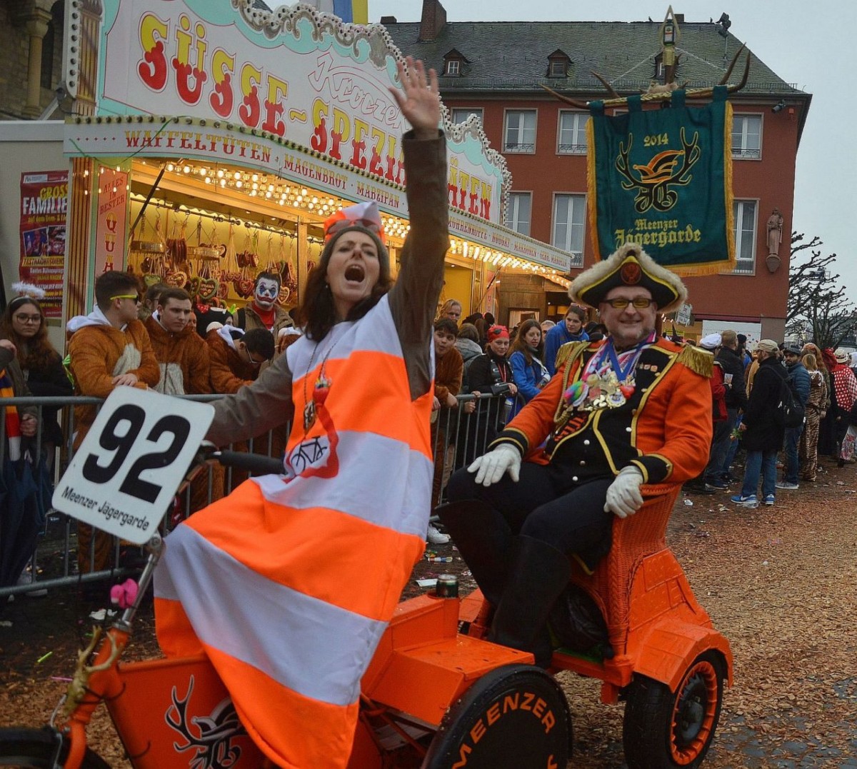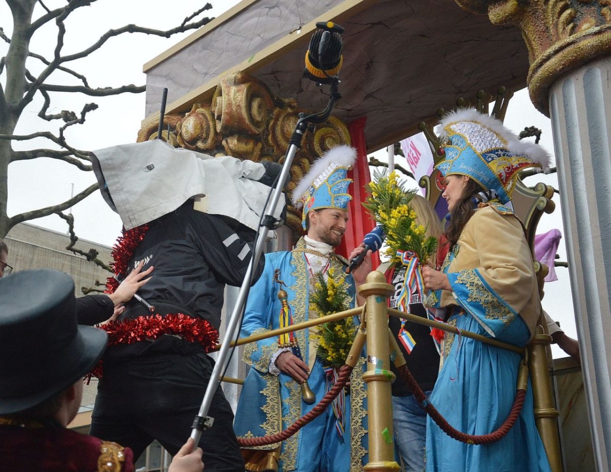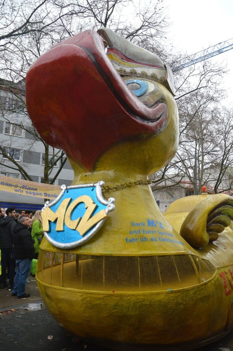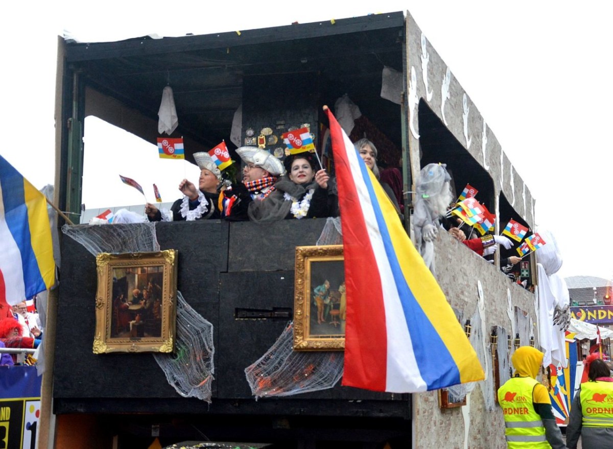 Der Himmel so grau, die Narren so bunt: Friedlich, fröhlich und ausgelassen haben am Montag an die 500.000 Narren in Mainz den Rosenmontag gefeiert. Pünktlich um 11.11 Uhr setzte sich in der Mainzer Neustadt der 69. Mainzer Rosenmontagszug nach dem Zweiten Weltkrieg in Bewegung – und pünktlich um 11.11 Uhr öffnete der Himmel seine Schleusen. Ein kräftiger und ausgesprochen hartnäckiger Nieselregen vergällte den Mainzer Narren den Start in den höchsten närrischen Feiertag. Abhalten ließen sich die meisten davon indes nicht, warm eingepackt in bunten feierten Hunderttausende den Zug, die Narretei und die politische Satire. Es wurde ein langer Tag: Der Rosenmontagszug dauerte fast eine Stunde länger als sonst, auch wegen der vielen großen Lücken im Ablauf.