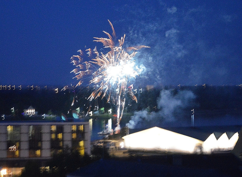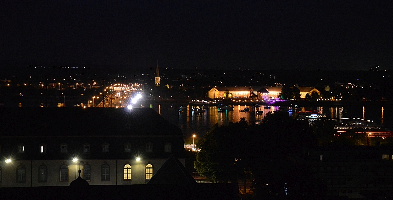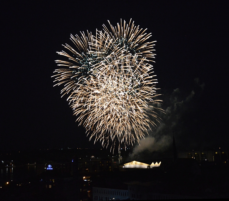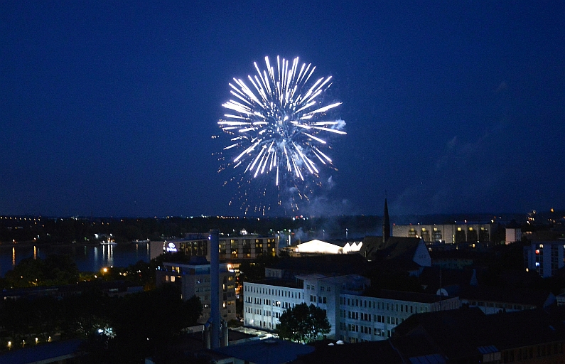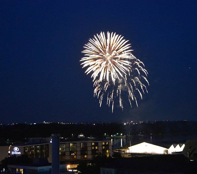 Genau sieben Minuten währte die Feuershow über dem Rhein, um 22.43 Uhr startete die erste Rakete mit lautem Rumms von der Fähre vor dem Mainzer Hilton. Genau sieben Minuten lang stieben Raketen in den Nachthimmel, malten Rosetten, Goldregen und sogar rote Herzen in die Nacht. Für viele Ohs sorgten auch die Fallschirm-Raketen, die minutenlang über Mainz schwebten – sensationell. Doch insgesamt fiel auf, dass viele einzelne Raketen und weniger Bilder ineinander gemalt wurden als in den Vorjahren, es fehlten irgendwie die Kaleidoskope am Himmel. Ihr könnt ja mal die Fotos vom Vorjahr vergleichen.
