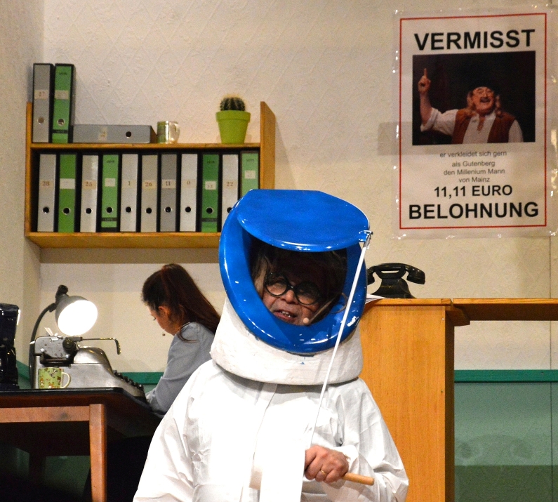 Im Gonsbachrevier geht es eher gemütlich zu. Schimanski – Sitzungspräsident Sebastian Grom mit Trenchcoat und Pferdeschwanz – und sein Kollege Wachtmeister Becker (alias Rudi Hube) kommen natürlich erst mal zu spät – der eine ist über die Schiersteiner Brücke gekommen, der andere über die Weisenauer. Nix wie Stau in Mainz. Der jungen Kollegin Melitta wiederum steht eine hochmoderne Schreibmaschine zur Verfügung – und an der Wand hängt eine Vermisstenanzeige: Gesucht wird Guddi Gutenberg, denn der hat vergangenes Jahr seine Druckermütze ans Denkmal gehängt und ist verschwunden…