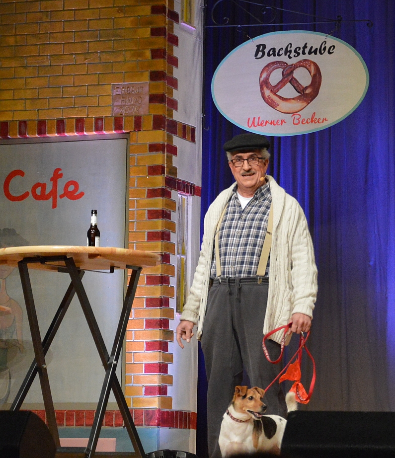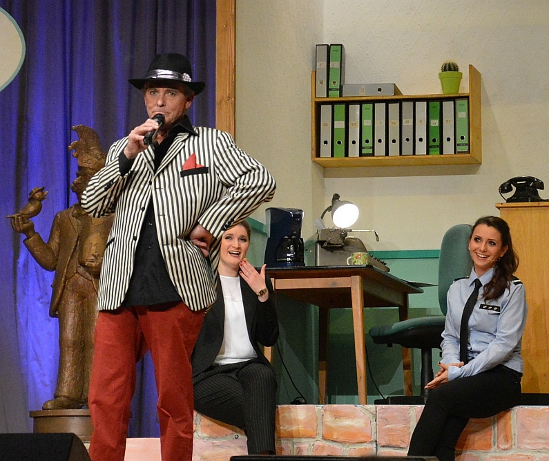 Hund Willi schnüffelt ganz echt auf der Bühne herum und freut sich so sehr über seinen Auftritt, dass er ganz in echt und völlig ungeplant was auf der Bühne fallen lässt. „Es ist dringend, mein Hund muss müsse“, spornt da das Herrchen gerade die Polizisten vom Revier an – der Saal johlt vor Lachen. Auch wenn zwischendurch was schief geht – hier wird es schlicht Teil der Narren-Inszenierung.