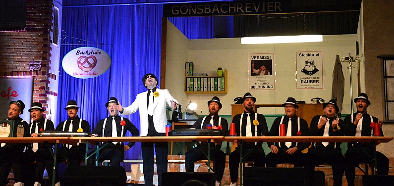 Der GCV sitzt auf dem Trockenen! Da ruft Schimi Grom gleich den Notstand aus, lässt den Ort abriegeln und alle verfügbaren Einheiten fahnden. Dass da ja auch noch eine Leiche war – Nebensache. „Wer der Mörder ist?“ fragt Kojak. „Im Zweifel ich“, sagt ein Mann in grüner Latzhose und stellt sich freundlich vor: „Ich bin der Gärtner. Claus Theo Gärtner.“ Es sind wieder einmal die vier GCV-Narrenstars Michael Emrich (Gärtner), Benno Hellmold (Kloagent), Christian Schier (Kojak) und Martin Heininger (Leichenstatist), die den Saal zu Lachsalven rocken. Als „Zwischenspiel“ legen sie den ganzen Krimi-Sumpf des deutschen Fernsehens offen und kalauern sich quer durch die Filmszene („Sean penn“, „Agent Null Null jagt Dr. Klo“).