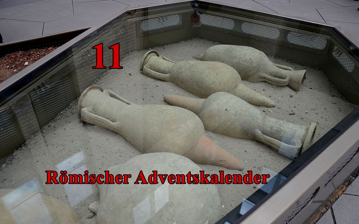 Doch schon in dem Innenhof, frei zugänglich von der Rheinallee aus, begegnet dem Besucher ein ebenerdiger Schaukasten. Darin sind vier große Amphoren ausgestellt, und damit hat es eine besondere Bewandnis: Die großen Gefäße kamen in Massen auf den römischen Schiffen aus dem Süden und brachten Öl, Wein und wohl auch das römische Garum – eine Fischsoße – an den Rhein.