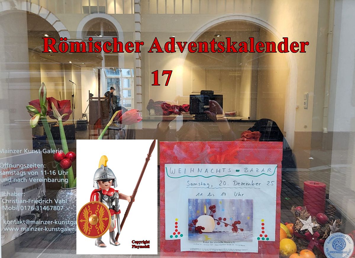 Info& auf Mainz&: Der Römische Weihnachtsbazar zugunsten des Vereins „Rettet das Römische Mainz“ findet am Samstag, den 20. Dezember 2025 von 11.00 Uhr bis 14.00 Uhr in der Mainzer Kunstgalerie in der Mainzer Altstadt statt. Mehr zu dem Verein lest Ihr hier – dieser Adventskalender entsteht in Kooperation mit eben diesem Verein, der Mainz& mit Informationen und Fotos unterstützt. Alle Türchen unseres Römischen Adventskalenders findet Ihr hier auf Mainz&.
