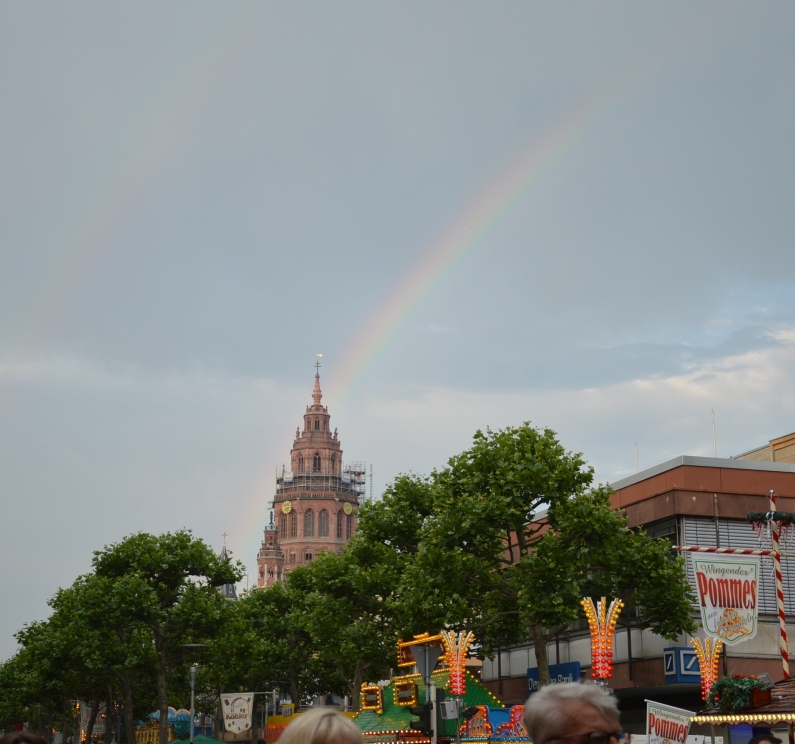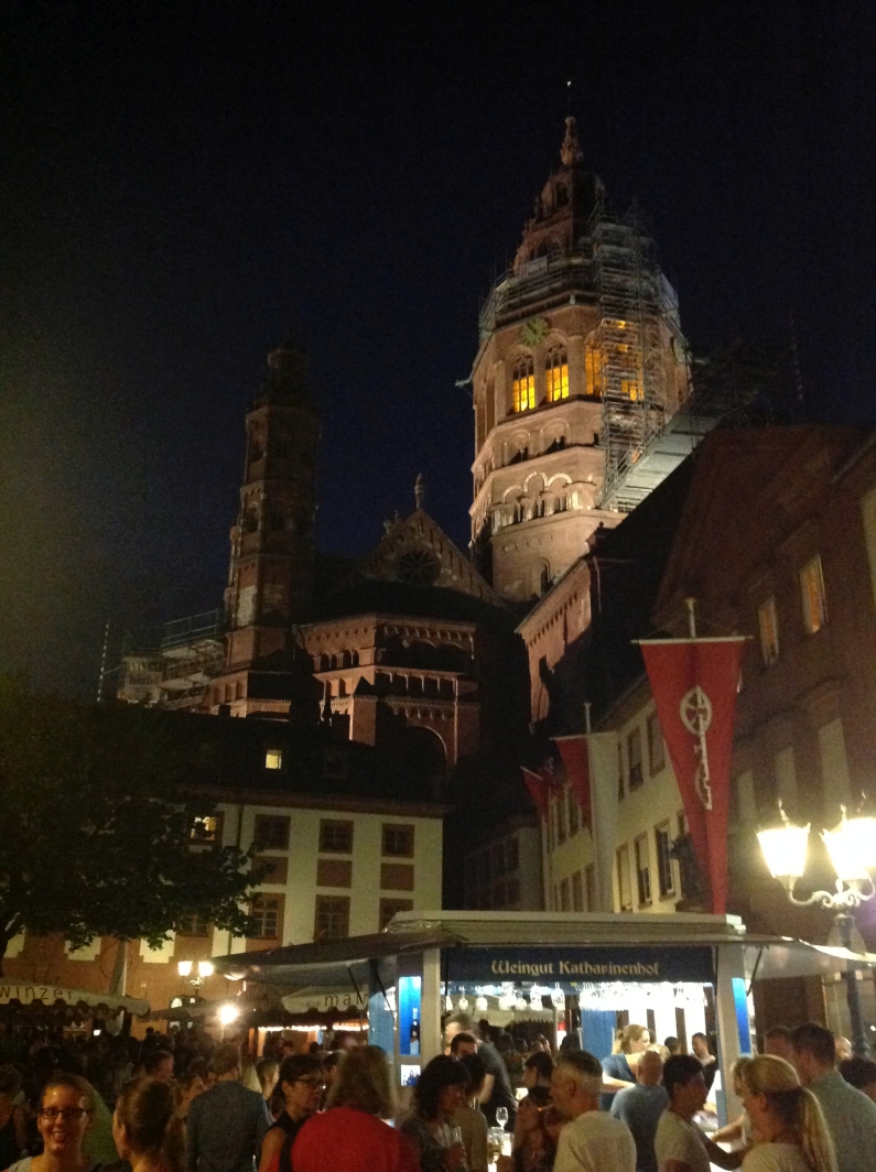 Und wie: In Scharen strömten die Menschen in die Innenstadt, flanierten über die LU, lauschten den ersten Bands auf dem Schillerplatz. Im Weindorf auf dem Markt zu Füßen des Doms gab’s auf den Bänken keinen einzigen freien Platz mehr, auf dem Leichhof herrschte dichtes Gedränge rund um die Stände der Mainzer Winzer. Es war aber auch eine zauberhafte Nacht: Zu den warmen Sommertemperaturen gesellte sich gelegentlich ein leichtes Lüftchen, die Wolken verzogen sich vom Himmel – und Petrus segnete Dom und Fest mit einem wunderbaren Regenbogen.