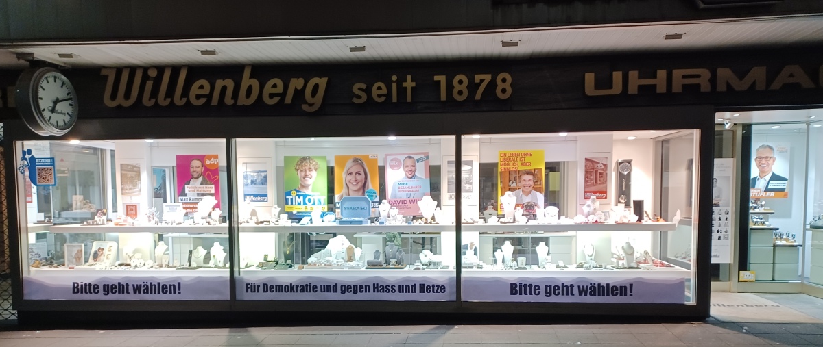 Plakate im Schaufenster: „Politik nah bei den Menschen machen“