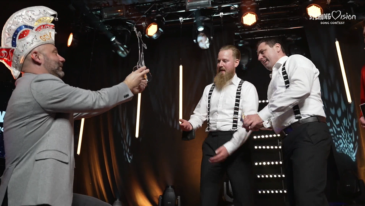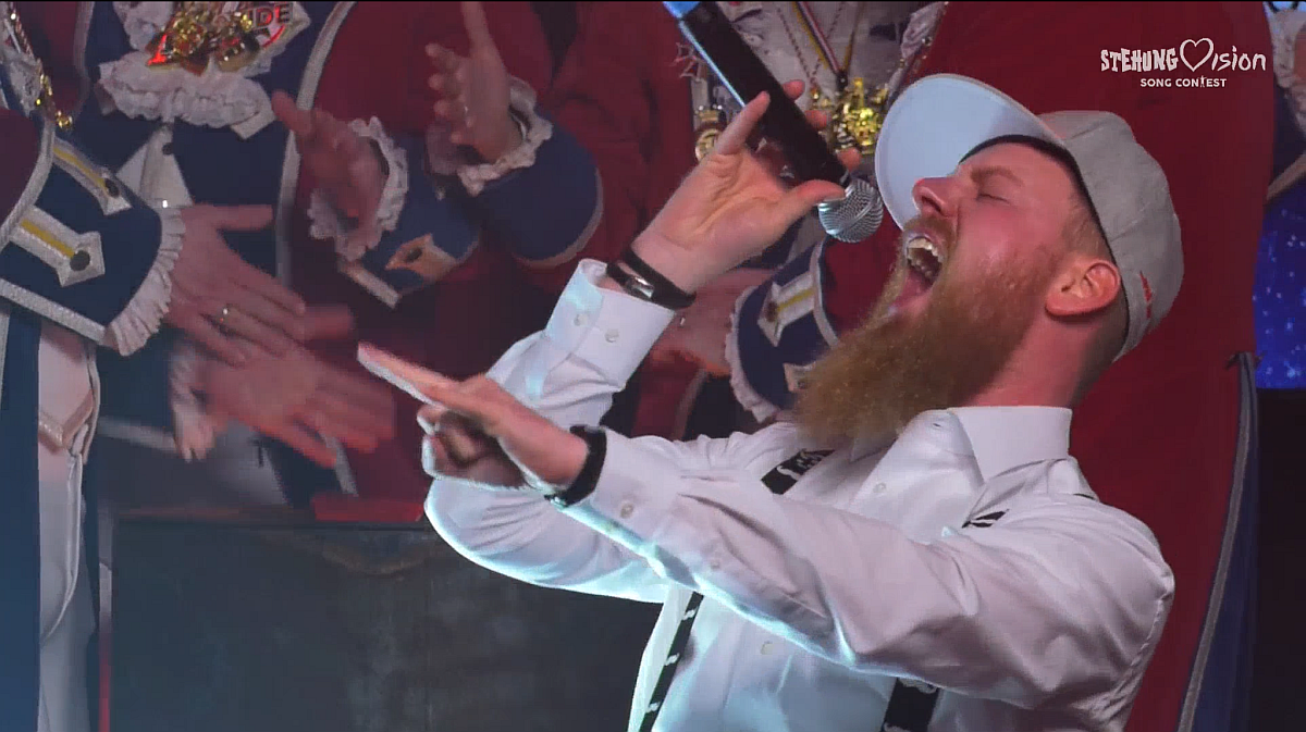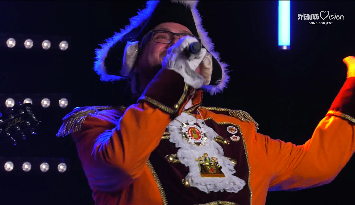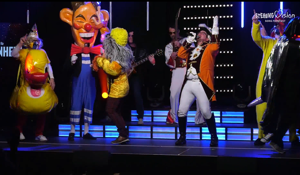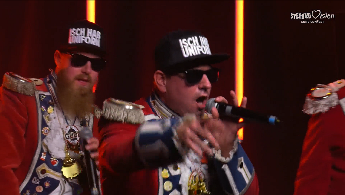 Das Kontrastprogramm sind natürlich die „Rot Rock Rapper“ mit ihrem gerappten Megahit „Ich hab‘ Uniform“, die, natürlich mit Ghettotonne im Gepäck, für die Neustadt antreten. Ihr Megahit zieht noch immer und katapultiert die coole Prinzengarde-Truppe am Ende auf Platz zwei – hauchdünn vor dem „Hähnchengrill aus Drais“. Am Ende werden die Zuschauer zum digitalen Tele-Voting gebeten, eine „Promi-Jury“ vergibt zusätzlich jeweils elf Punkte – nur leider an Teilnehmer, die gar nicht dabei sind.