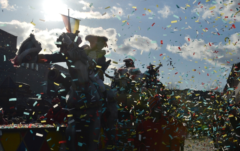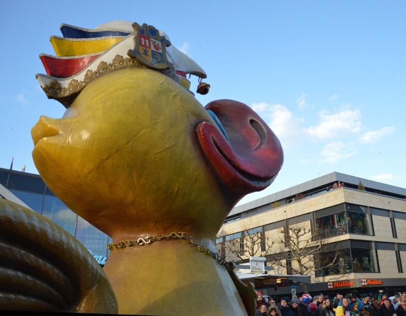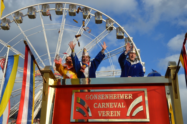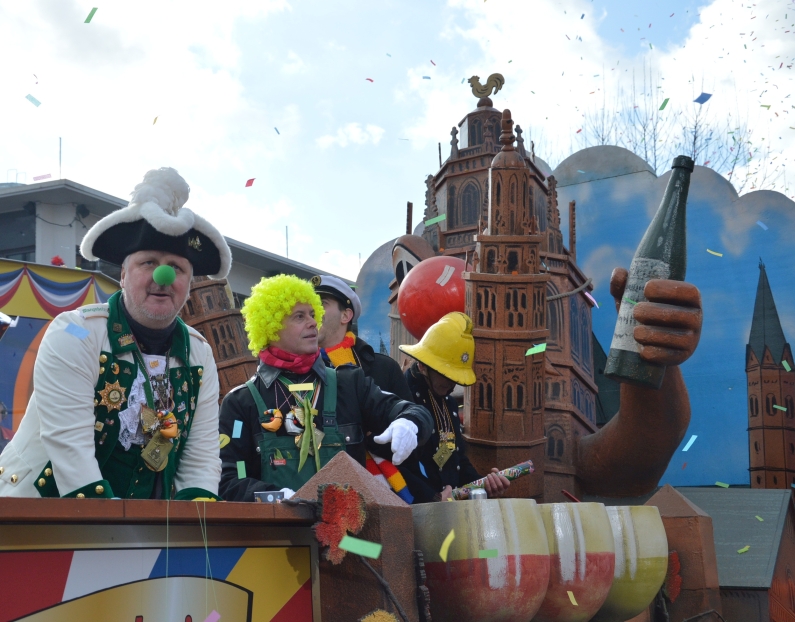 Der große Narrenzug verlief störungsfrei: 161 Narrenschiffe und Komitteewagen zogen durch die Straßen, auf ihnen auch viele Aktive aus den Fastnachtssitzungen. 113 Traktoren und Zugmaschinen zogen die Gefährte, auch 33 Zugpferde kmen zum Einsatz, dazu zwei Ochsen. Zu Zwischenfällen kam es im Gegensatz zum Umzug in Köln nicht, auch die insgesamt 107 Reiter kamen unfallfrei ins Ziel. „Die Vereine haben sich eigens eine eigene Reiterordnung gegeben“, sagte Zugmarschall Markus Perabo. Die Tiere seien übrigens keineswegs ruhig gestellt – die Pferde werden vielmehr im Vorfeld eigens mit Musik für den Umzug trainiert.