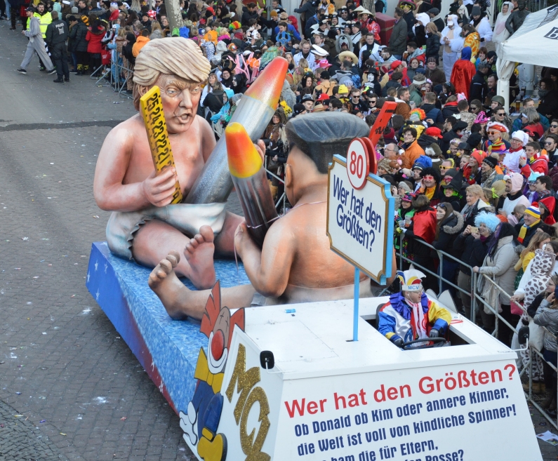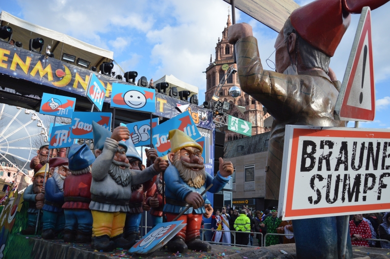 Fünf Stunden lang dauerte der Umzug auch so schon, in der ganzen Innenstadt wurden die bunten Kostüme und die Narrenwagen bejubelt. Das Helau donnerte, Bonbons, Bälle und Süßigkeiten regneten nur so auf die Narren am Wegesrand hernieder. Für besonders viel Gelächter sorgten die 13 politischen Motivwagen des MCV: Da ragte SPD-Chef Martin Schulz als „Rohrkrepierer“ aus der rauchenden SPD-Kanone, stemmte sich die Kulturdezernentin Marianne Grosse (SPD) verzweifelt gegen den Bibelturm am Gutenberg-Museum, den eine Bürgerinitiative zu Fall bringt. Aus dem braunen Sumpf ragte unterdessen AfD-Chef Alexander Gauland, der eine Horde Zwerge fragt: „Wollt Ihr den totalen Zwerg?“