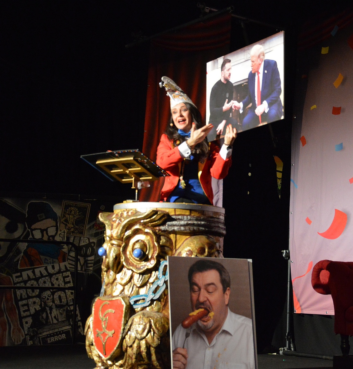 Doch Betz interveniert: „Ich muss mal streng mit Ihnen sein, liebe Politiker, da wird jetzt nicht über Politik geredet! Das übernehmen wir nämlich auf der Bühne!“ Zuständig dafür ist allen voran die Protokollerin: Chrissy Grom, seit 2025 im Dienst des GCV erste weibliche Protokollerin der Mainzer Fastnacht, hält in diesem Jahr nun auch zum ersten Mal ihre offizielle Narrenrückschau bei der GCVrau – ein exzellent gereimter Rückblick auf das Politikjahr.
