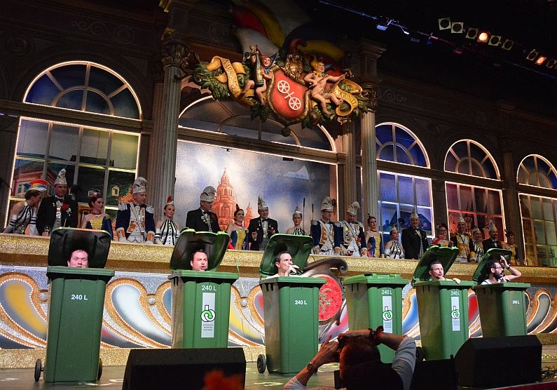 „Ich habe beim GCV viel gelernt, mehr als in der Schule“, bekannte „der Toby“, und staunte selbst ob der Kulisse von 2.500 begeisterten Fans im Saal. Ohne Zugabe ging das nicht, die Hymne, wie man ein Mainzer wird, durfte einfach nicht fehlen: „Sieben Schoppe musst Du übersteh’n, sieben Mal zu den Nullfünfern geh’n“. Dabei hätte sich der Saal gar nicht so anstrengen müssen: Kaum war „der Toby“ von der Bühne, kam er auch schon wieder – in einer von sechs Mülltonnen. Aca & Pella gaben zum Jubiläum noch einmal die legendäre Mülltonnen-Helau-Nummer, die sie einst auf die Fernsehbühne bei „Mainz bleibt Mainz“ katapultierte. „Es war immer was los in der Tonne“, rekapitulierte Mann, und dann gab es improvisierte Standup-Comedy vom feinsten, garniert mit alten Aca & Pella-Hits – ganz großes Fastnachtskino.
